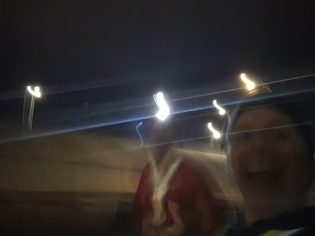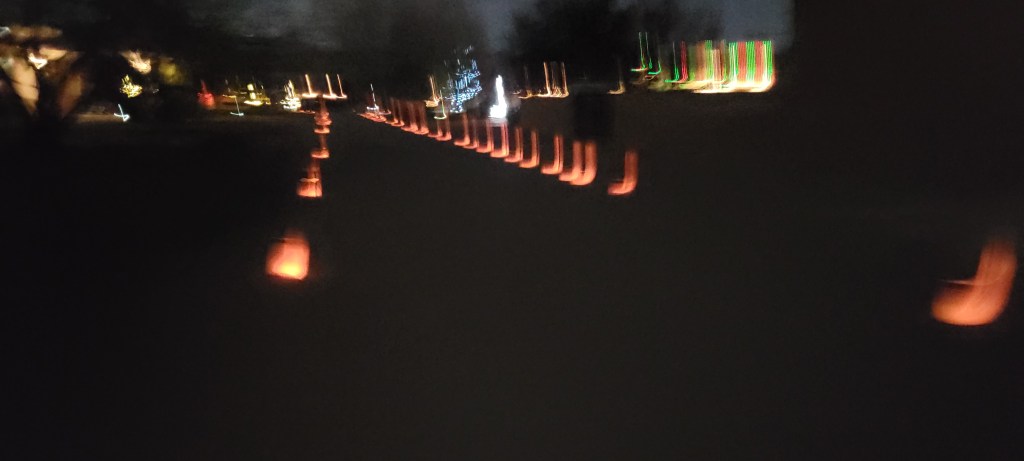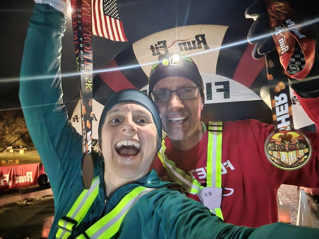 Making it even more magical, we were in a time window where the course was still set up, the roads were still closed to traffic, and there was still some race staff at their posts guiding the way. And we had it all to ourselves. It was as if they set the whole thing up just for us. We had a holiday date night, jogging together in the crisp evening air through a holiday light show, just the two of us.