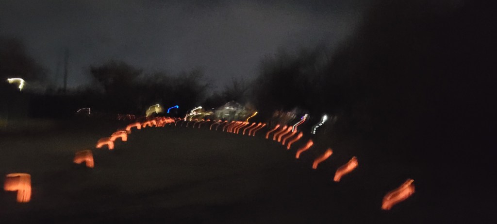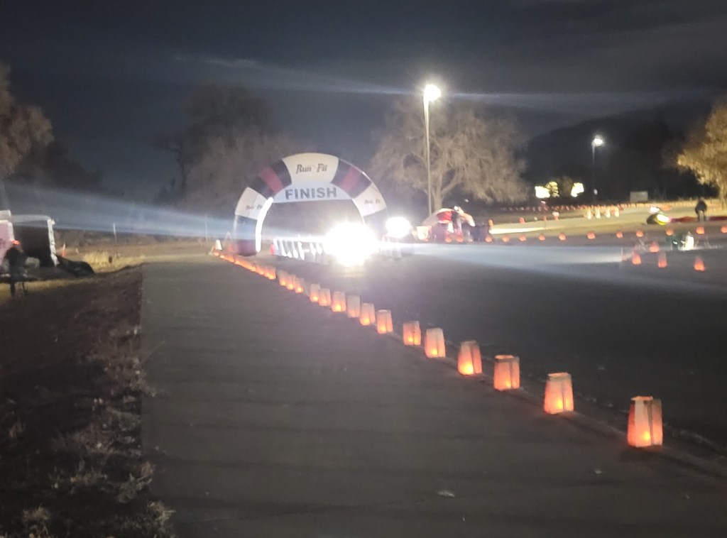 The flashing blue and red lights of the escort vehicle led us through the first half mile of the evening race and into a twinkling holiday wonderland. Thousands of farolitos (known outside of New Mexico as luminarias) lined the flat course as it ran through neighborhoods with house after house and yard after yard of elaborate holiday light displays. It was like a candlelit run through a snow globe scene (without the snow).