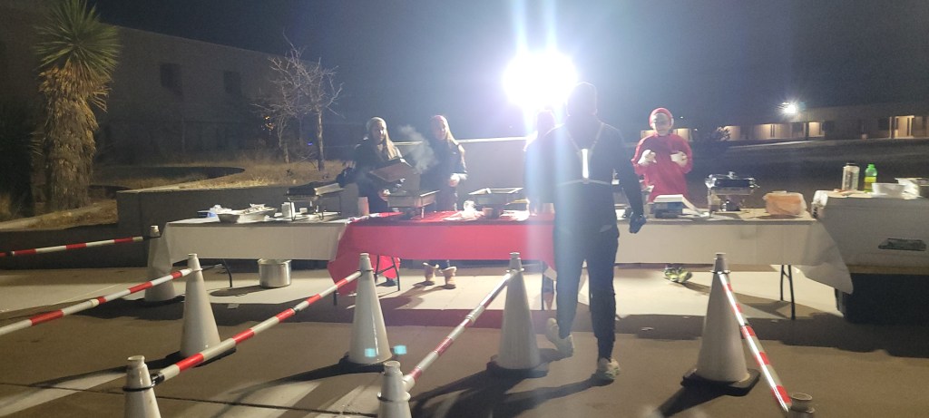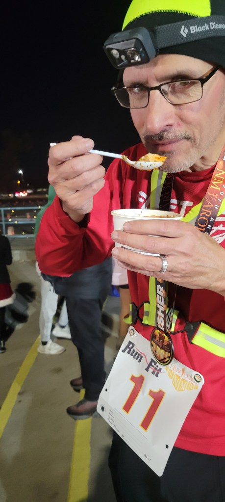 The fun continued beyond the finish line, where people celebrated, video screens showed race highlights, and volunteers at food tables served up posole. And Stephen wasn’t done showing us the holiday spirit as he grabbed us at the finish line and made sure we got a chance to grab some of this delicious New Mexico treat. Posole is a spicy traditional Mexican stew made with meat, hominy, and other ingredients. And it is goooood.