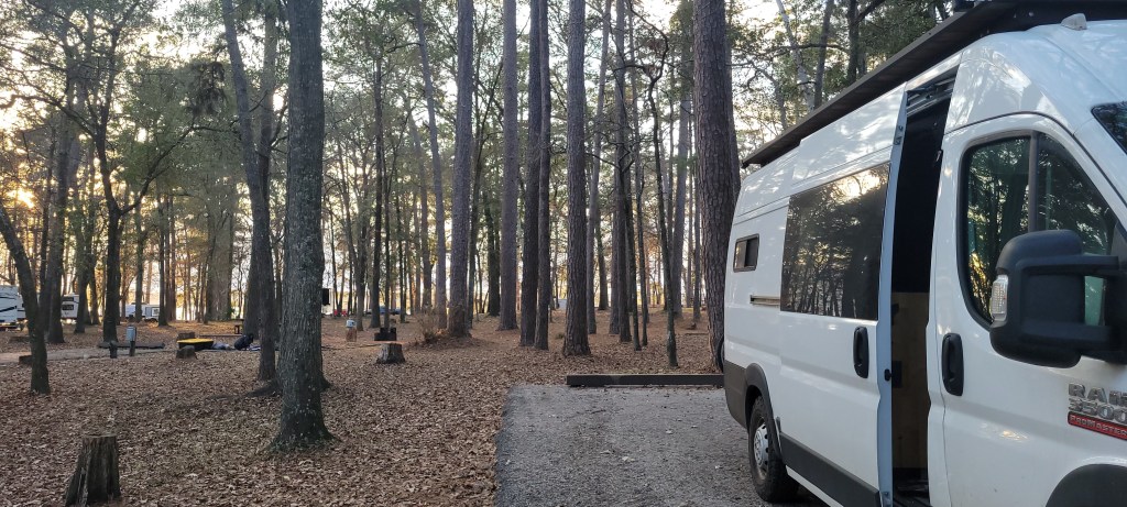 Julie had gotten a later start to Houston than planned thanks to a wonderful and spontaneous Christmas Eve lunch she had at the campsite that you can read about in our People Along the Way section, so she was unsure if she would reach her goal to wake up on the beach Christmas morning without needing to drive anywhere. But, she left Houston at 5PM and, after a swing by the grocery store to quickly restock, Julie took on the 4 hour drive to a first-come, first-serve campsite with her fingers crossed that when she rolled in at 10PM, there would be a spot waiting for her. There was.