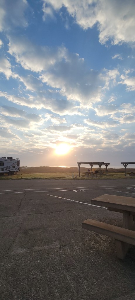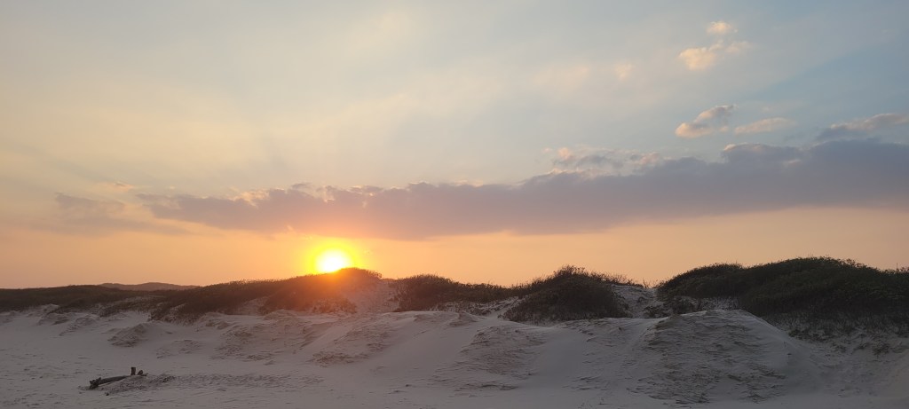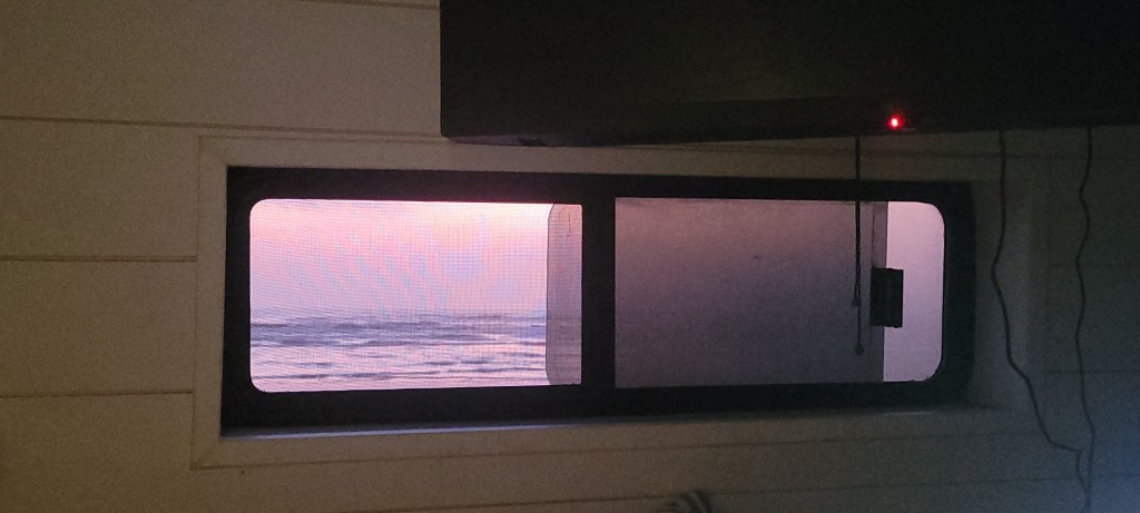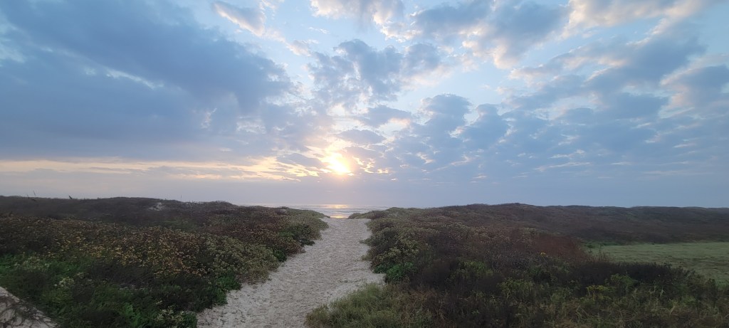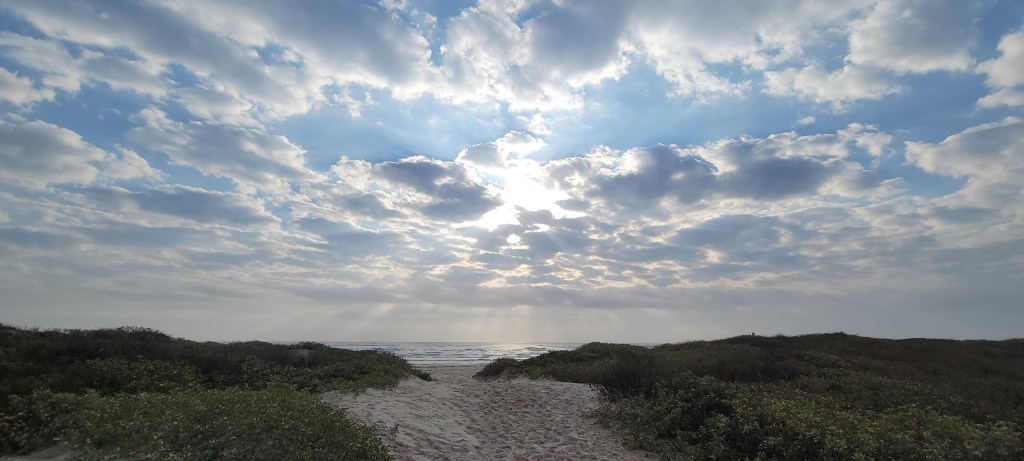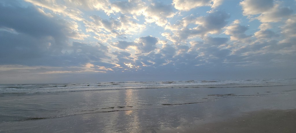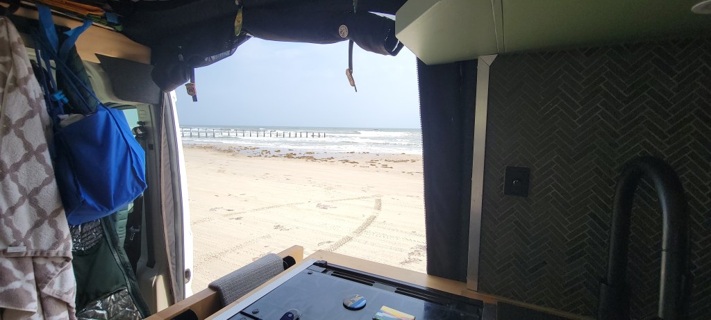 For her third night at Padre, Julie had been thinking and mulling over whether to stay at Malaqite or whether to drive a few miles down the road to do something she had never done before but had read about – beach camping. On one of Julie’s runs she had ran to the section of the beach where beach camping is allowed and there were lines of cars and campers stretching out into the mist right there at the water’s edge. Julie was intoxicated, excited and also nervous about how the van would handle the sand. It was clear that the sand was hard-packed in some spots and there were other spots where it was the kind that would just suck tires right into it. She had read reviews on line and read stories of some camper vans that had gotten stuck in certain spots. From what she could tell, this spot was one that was safe to go for, only a few spots at the entrance to the beach that would possibly give any trouble. She was nervous about it, but then figured, what’s the worst case scenario – I have to call AAA again, or maybe some nice strangers will help me out like our last two such experiences. And, she thought, there is no way I am coming all the way down here and not taking advantage of the chance to camp right on the beach.