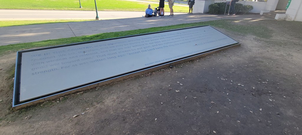 We also were greeted at our first Texas rest area with the first monument to the confederacy. We had taken note on our trip thus far that busts and pictures and street names and building names all bearing the likeness of one of our most famous presidents, Abraham Lincoln, had abounded in nearly every state we went to and more than any other figure, even more than George Washington. We had postulated that that would likely become more scarce once we circled down into the south. Texas was our first state in a long while that we saw little mention of this iconic figure. Most of the figures we saw streets, cities and buildings named after and monuments and busts commemorating were distinctly Texan names. Heroes and leaders from Texan lore or born and bred in its borders. Many of these were people whose names we were only distantly familiar with. Sam Houston’s name was everywhere. We knew only of the city named after him before our time here in Texas and Julie only learned his first name while here in the state. Julie never realized that Davy Crocket was one of the men who died bravely in the Alamo and the speaker of one of Texas’s most proud and famed quotes. She only knew him to be as the song said, “king of the wild frontier”. The famous quote, “Victory or Death”, had been vaguely familiar to us, but we didn’t know of the Texan that had said it, a massive figure in Texas history, William Barret Travis who also, as legend tells it, is the origin story for the phrase of “drawing a line in the sand”, which is what he did at the Alamo before it was overtaken in defiant bravery. These are three of the figures that loomed largest as we traveled the land of Texas and learned about its modern life and the history that built it.