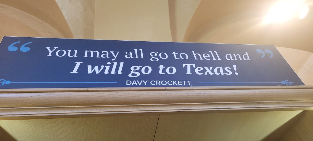 Then there was the third thing that struck Julie – she didn’t know anything about Texas history really at all. She knew it was important to remember the Alamo. She knew the Alamo had been seiged. But that was about it. She didn’t know who was doing the seiging and why. She didn’t know the story of Texas or the Republic of Texas or who Sam Houston was or what he did. She didn’t know that he was the general that cried out to his 800 men in the surprise attack at San Jacinto that would happen soon after the Alamo was overtaken, “Remember the Alamo” as he led them to turn and charge the Mexican Army in a fight for their independence from what had become a no longer freedom loving government (despite having recently fought for their own independence from Spain). She didn’t know it was a battle that was over in 18 minutes. She didn’t know that one of the reasons Texas wanted freedom and independence was that they wanted the freedom to enslave others (a concept that Julie struggles to wrap her mind around how one can hold such a thought in mind as a coherent one). She didn’t know so much about the history of Texas and felt like she was drinking water in a desert of her own ignorance. Everything she learned made her understand more and more what makes Texas what it is and who it is today and only lite the flame brighter in her to want to learn more.