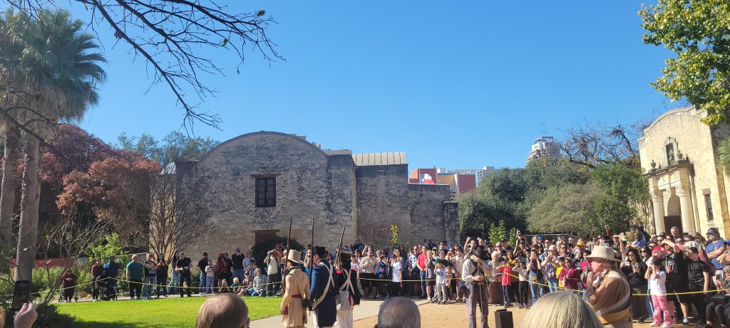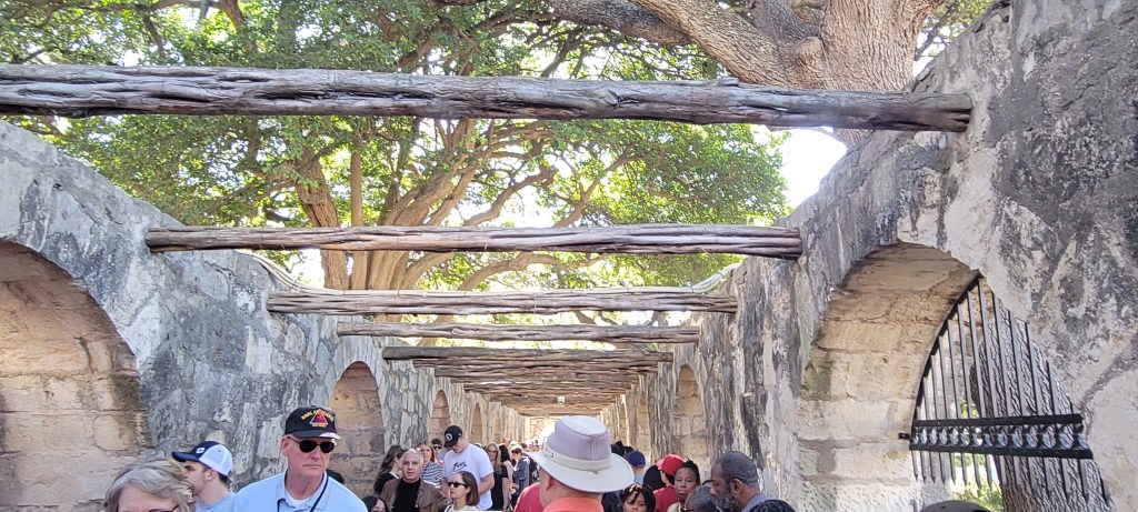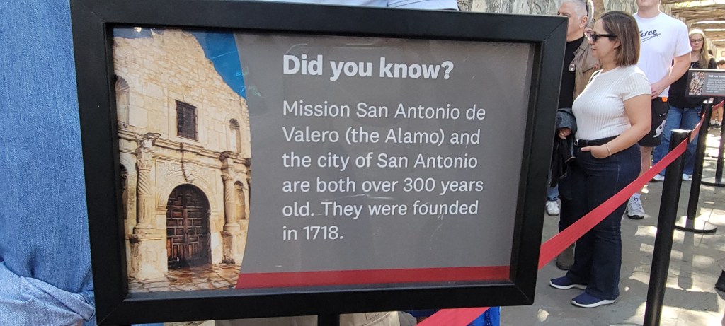 Firstly, she had expected it to be, like so many other historical sites, a piece of history separated out from the modern world, one that you would need to drive outside the main thoroughfares to get to. Not at all. Alamo Plaza was a modern plaza, complete with a huge mall and movie theater just steps from the historic site. The centuries-old site sat like an oasis of history right in the center of the modern hustle and bustle. This was actually pretty neat, as it leant even more to the feeling of the history being present and fully alive. It seemed to lend a deep dimensionality and ease to the task of “Remembering the Alamo”. The Alamo wasn’t a piece of history set aside for only historians and history buffs to make their way to, it was in sight and top of mind. The contrast between the modern architecture and the Alamo made it all the more striking when the historic buildings came into view.
