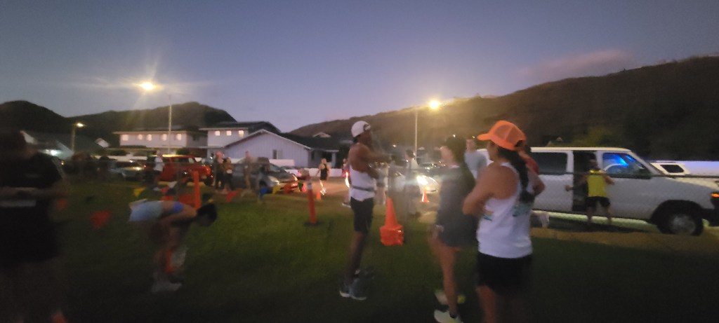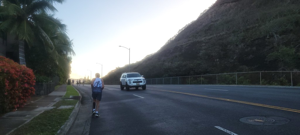 We each had our own strategy for approaching twice the miles than we’re used to racing. Julie focused on having a good time and running her forever pace – the pace at which she felt she could go indefinitely. To fully understand her race, a little context is needed. When we touched down in Hawai’i the afternoon before on New Year’s Eve, Julie realized something while disembarking the plane. She had left her watch charger in the van, now a couple three thousand miles of ocean away. For anyone that knows Julie and how much she LOVES numbers and data, you know this is VERY uncharacteristic behavior of her to leave such a thing behind. Julie took this as a sign from her mischievous subconscious mind that she wanted to enter the new year and our first race of the year numberless – and so she acquiesced and decided to wait until after the race to make a trip to the Honolulu Walmart (that had exactly one charger left – you didn’t think Julie was going to spend an entire two weeks without her numbers – no – one day, people, one day). As soon as the run started, Julie was feeling quite happy with her subconscious mind – it was a nice freedom to have this completely open space to just get back to basics. For the year before the trip started, Julie had been running for almost 16 months without ever looking at her watch until her run was over. Her whole focus had been attuning to her body and running without focus or agenda, just to enjoy. While Julie enjoyed the focus and tracking she did when running races during the trip, it was a wonderfully refreshing way to kick off the new year – for it to just be her and the open road. That especially helped manage the double distance we tackled on this first day of 2025. Julie went into the race feeling strong and fairly rested even though we had spent all of the previous day flying and, thankfully, had been woken up mid-slumber at Hawai’i’s midnight by the fireworks we could see from our porch after having fallen asleep on our jet lag time schedule at 7PM Hawai’i time.