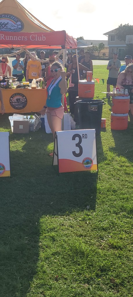 The only downside to running without a watch could be found in the fact that this particular race did not have mile markers. This meant that Julie had no idea where she was in the race at any time. When coming through what Julie estimated was probably about the 5 mile mark, she saw Ryan not too far in front of her. She was feeling strong and had plenty left in the tank. Julie absolutely knew she could easily overtake him if this had been near the end of the race – but, still having what she guessed was a good mile ahead, she decided to continue taking it easy. That’s when Julie turned a corner and realized she had grossly overestimated the course and she was all of 500 yards from the finish line. By the time Julie realized she could have easily sped up to catch Ryan, he had already crossed the finish line. Luckily, she was so chill, feeling the rhythm and flow of the miles, basking in the glow of the Hawai’i sunrise and her hopes and dreams for the newly beginning year, she easily accepted the missed opportunity and sailed on over the finish line feeling like she could run a whole other 10K without skipping a beat – that’s when you know you landed your forever pace! Feeling equal parts strong and relaxed with plenty of fuel left in the tank to tackle whatever hills lay ahead was a great way to kick off a new year.