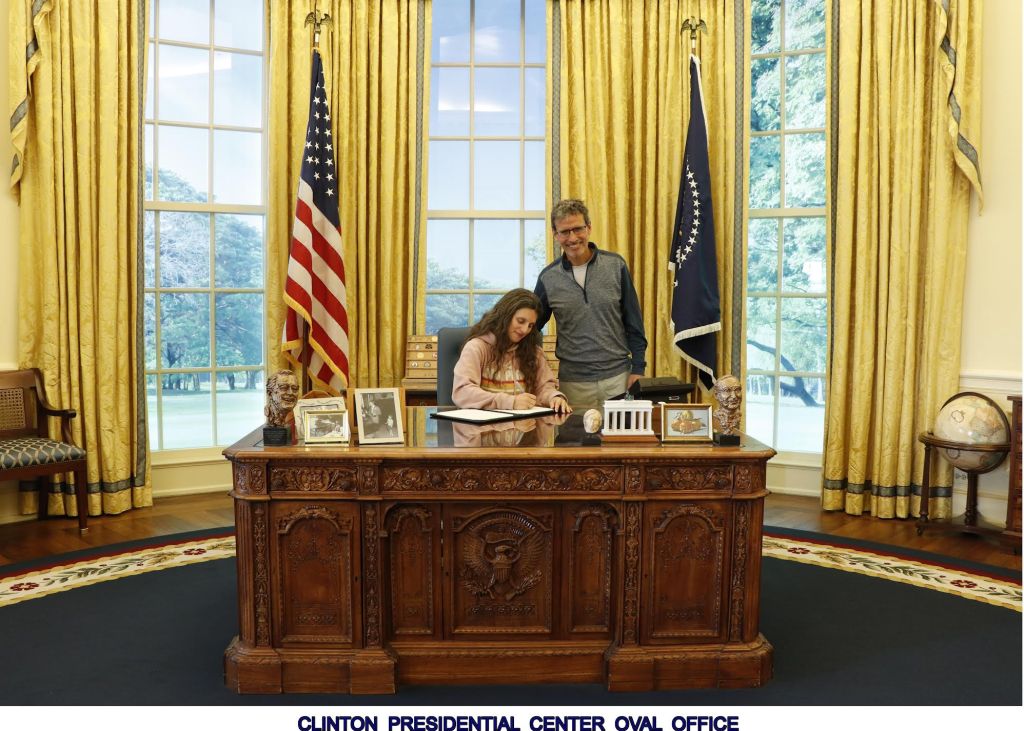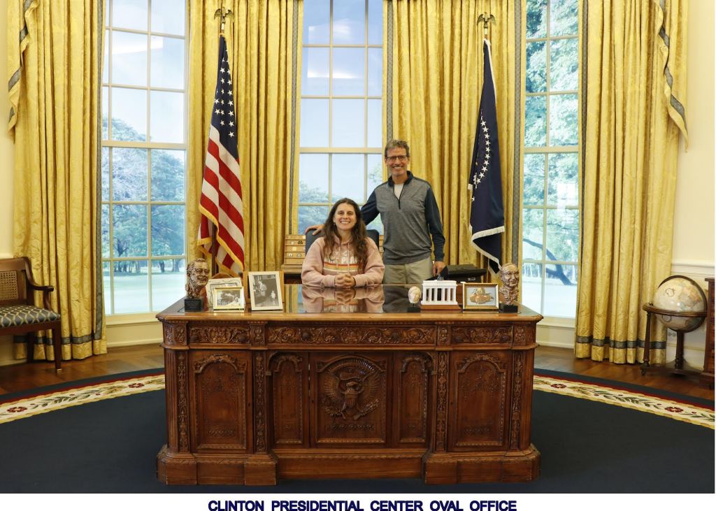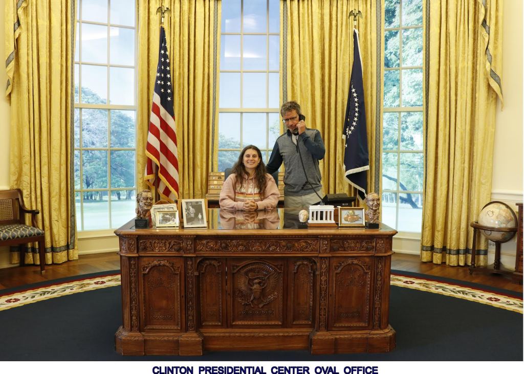 At the William J. Clinton Presidential Museum and Library there is a replica of President Clinton’s Oval Office. It was news to us that each president’s Oval Office, is in fact, different – one of those facts that, once you think about it, seems obvious, but not something to which you ever had reason to give more nuanced thought before encountering it. Visitors were not allowed to walk in the Oval Office unless they wanted to get their picture at the resolute desk – which we did, even though we knew we’d probably have to pay a ridiculous amount of money to get possession of the pictures. We considered it a must-do experience and an opportunity to contribute to the museum and so, we went for it.
