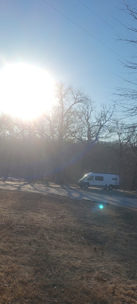 One of the downsides of the way we planned our itinerary is that there are a handful of states that we are seeing in the more drab months of January. January in places where the snow is bountiful is just as much a natural marvel as any sun-soaked beach or spring-blooming field or woodland. But, we tried to plan our itinerary in such a way where we wouldn’t need to navigate snowy roads or tackle a frozen water-tank that often. Not that one can’t travel in such temperatures (and Julie did it already in fall/winter of 2023 for a few weeks), but for all we wanted to fit in, we wanted to take that obstacle off of the table. That means that there are a lot of states whose natural beauty is harder to describe in our posts, cause we just didn’t see it in full bloom, or, sometimes, we didn’t see it at all. Missouri is a bit of an exception because we came here on a different trip that Julie took in May of 2023 before we got the van. Julie decided to take 5 weeks to take a memory lane trip where she traveled through all the geographic places of her life, in chronological order. Not only did it end up being a deeply revelatory and profound trip, one of the stops was in a teeny little Ozark town in Southeast Missouri called Hartshorn, where as soon as you notice you entered the town’s main street, you have already left it. Ryan had met up with Julie in Ohio to join her for the Missouri leg of the trip, so we got a chance to see the state in its late spring glory. Julie remembers, on that trip, falling asleep somewhere in Illinois and waking up deep into the rolling green of Missouri with the sun glistening and shining down on the tall grass prairies and deep rich forests. Julie still remembers the feeling of deep peace and calm she felt when she woke up from her nap surrounded in the beauty of Missouri. We saw beauty this time around, but it’s not the kind of beauty that is as easy to write about, or to write about with any hint of romantic appreciation – because it was all fairly drenched in a bit of January drabness. Furthermore, we just saw less of it, finding ourselves mostly in urban areas this time around thanks to our originally planned 7 days in the state having been reduced down to barely 5.
