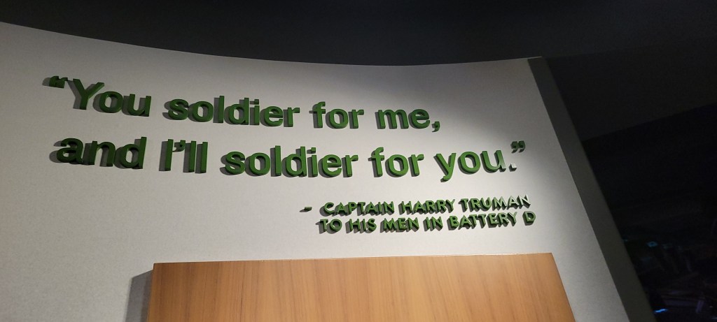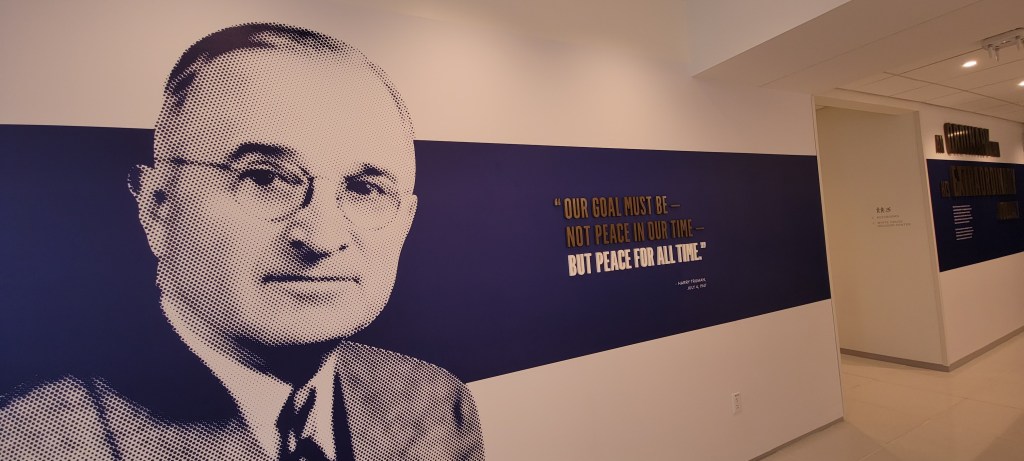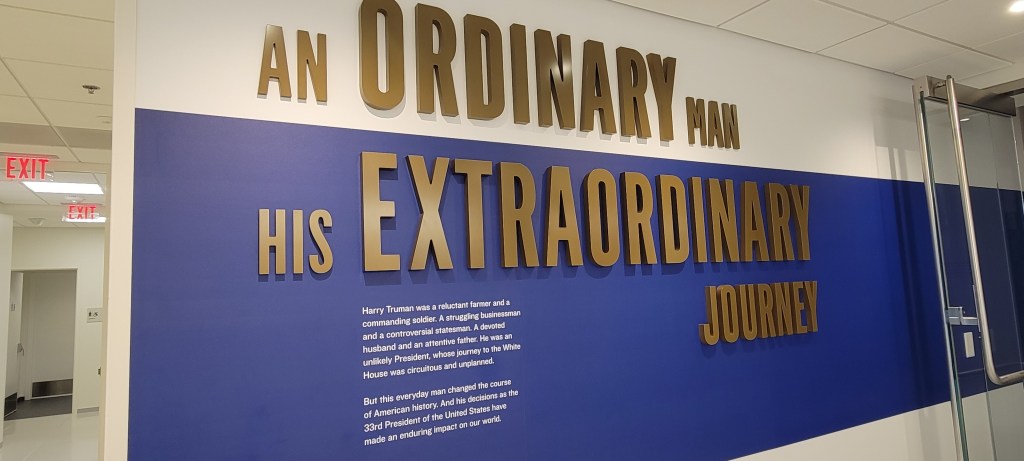 After our race and a stop at Big O Tires to finally get our tire replaced after putting the spare on the van back in Texas, we made our way up to Independence, MO just outside of Kansas City by 3PM, leaving us two hours to take in the Harry S Truman Presidential Museum and Library. It wasn’t nearly enough. It was a fantastic museum of an extraordinary President during an extraordinary time in history. Julie was lapping up nearly every word of history and only got through the museum to the end of World War II before we heard the announcement that the museum would close in 5 minutes. Ryan got through the whole of the museum, but did it by skimming many of the exhibits. There was a guest book there to be signed that would make its way to the Jimmy Carter Presidential Museum and Library in Georgia in honor of his recent passing. We wrote our message to President Carter and were looking forward to seeing the book again when visit his museum in less than a month in Georgia. We swung by Truman’s boyhood and adult home in Independence and took in the lovely town square of the modest and charming small town sitting right outside a huge city.