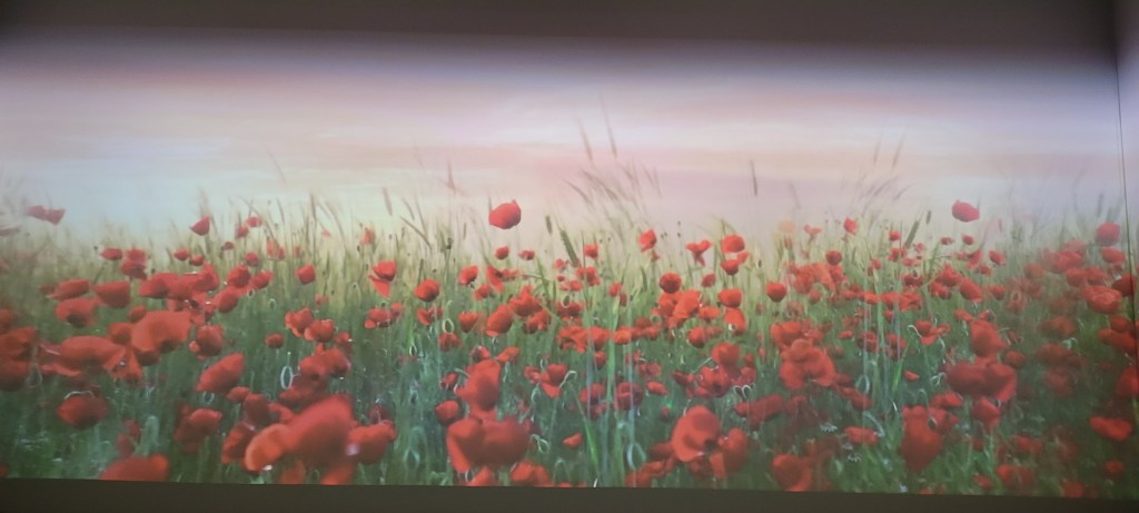 After spending the night at an RV park in Independence, we headed over to the National World War I Museum and Memorial in Kansas City. It was a profound experience. The museum had big metal doors that caught our attention and was built into the ground, purposefully so and for a symbolic reason that we remember learning, but we don’t remember what it was. The upside of going to so many sites and museums is that we are learning so much. The downside is that our brains are small and there seems to be only so much information that we take in that actually stays in. One of the motivations for us to write this blog is for our future selves. But, sometimes we don’t even retain what we learn long enough to get it recorded. But, it’s still nice to remember being edified, if only for a moment. The museum was really well done. Over this trip, we’ve come to be amateur museum connoisseurs, having more and more awareness of what makes a museum well done or not so well done. Some museums manage to take you into an experience in an immersive way where you walk away having felt something and having your perspective on that piece of history or on that piece of the present, or even on yourself, life or humanity at large expanded. The National World War I Museum definitely managed to accomplish all of those things. It started with a powerful walk over a glass floor with 9000 crafted poppies below. Each poppy represented a thousand dead. The poignancy was palpable.