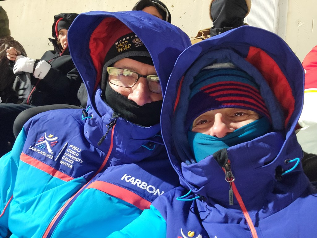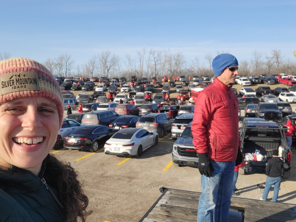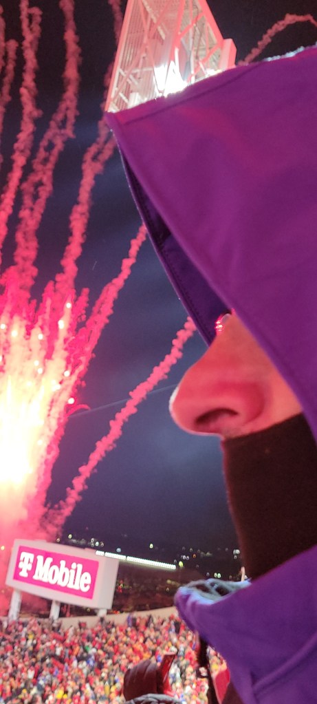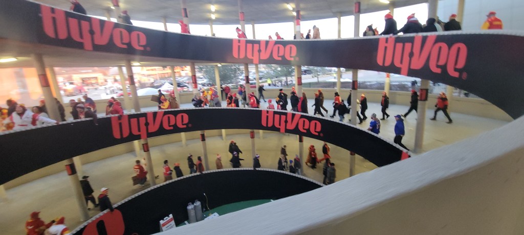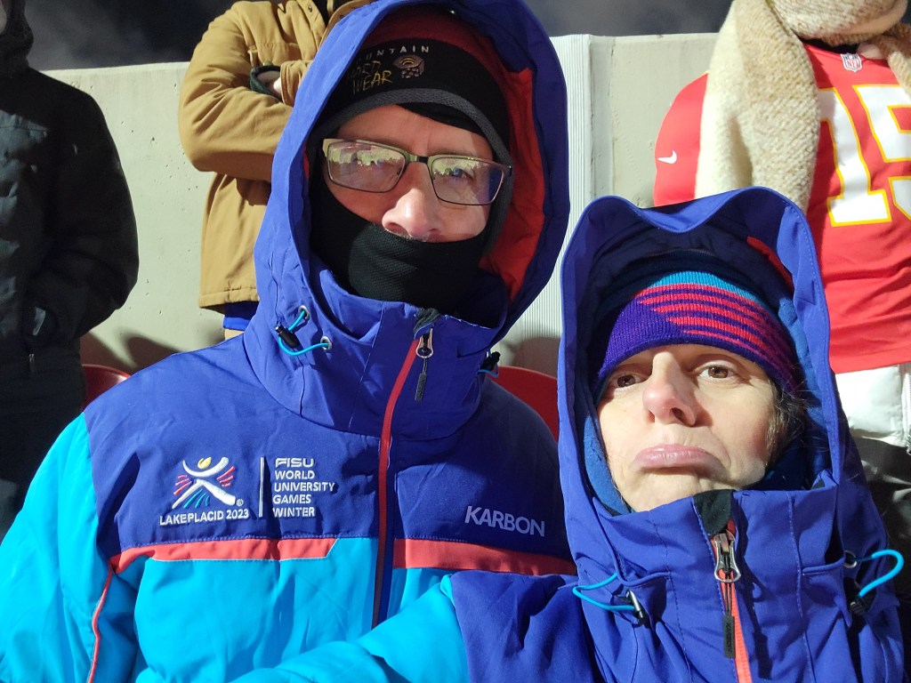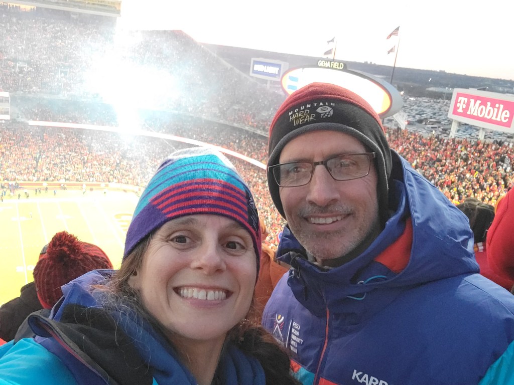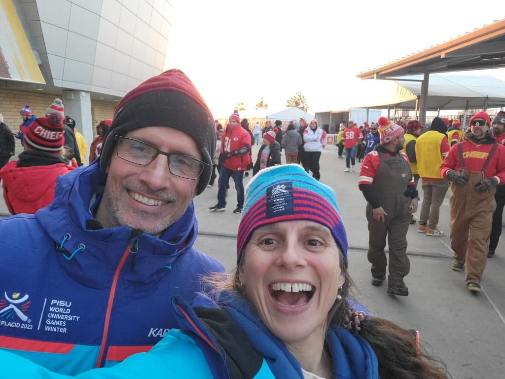 When we arrived at Arrowhead stadium 2 hours in advance of game time, it was a full on scene and we were so psyched to be a part of it. Julie used the opportunity to bake cookies while we watched sports pundits yammer on in debates about the Bills, the Chiefs, Allen and Mahomes and what this game would mean for each of them. We didn’t find the commentary all that compelling, but wanted to listen to it just to be in the spirit of it all in our spot amongst the thousands in the lot. We had no Bills garb with us, but we had our winter jackets with us from when we volunteered for the World Games in Lake Placid 2 years prior. The jackets were not only what we needed to keep warm, but they had the phrase, “I love NY” embroidered on their arm and their blue color with slight hues of red were enough to make it clear amongst the throngs of fans whose side we were on.