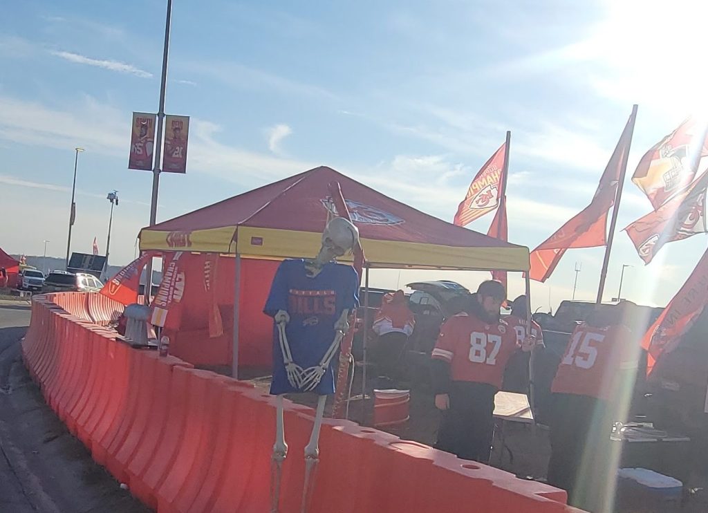 This spirit of friendly competition continued right on to the game. When we arrived, the parking lot was filled to the brim with tens of thousands of fans, some dressed in Buffalo blue and more dressed in Kansas City red. There were multiple spots of Bills and Chiefs fans tailgating together. The closest thing to animosity or violence we saw was a playful effigy of a Bills jersey-wearing skeleton hanging outside a lively tailgate. That was as dark as it got.