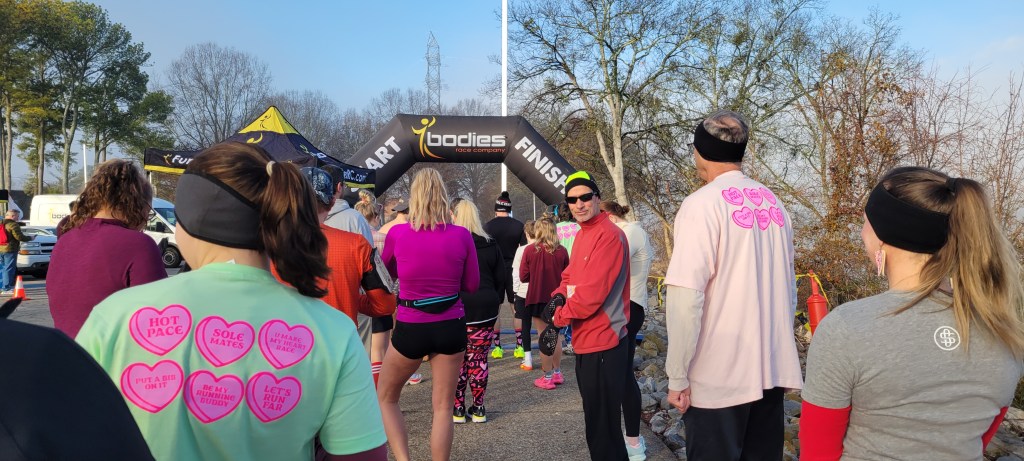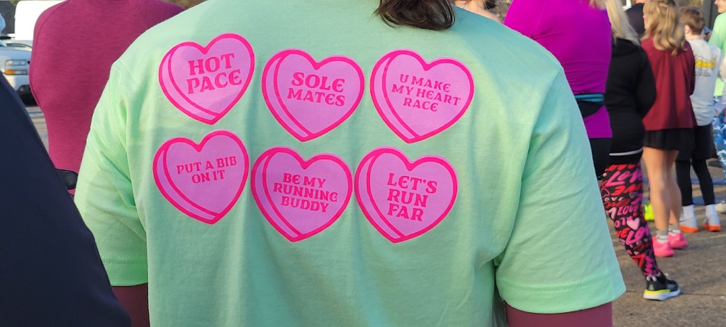The train pulled out of the station at 9:00 AM in Chattanooga, Tennessee, for the Couple Shuffle 5K. The Sunday morning race ran along the Tennessee River with a bright sun in the blue sky, a nice crispness in the forty-degree air, and hearts on the crowd’s minds. The Valentine-themed race gave out pastel-hued conversation heart t-shirts, pink-sashed heart-shaped medals encasing small conversation hearts, and boxes of conversation hearts at the finish area snack table.