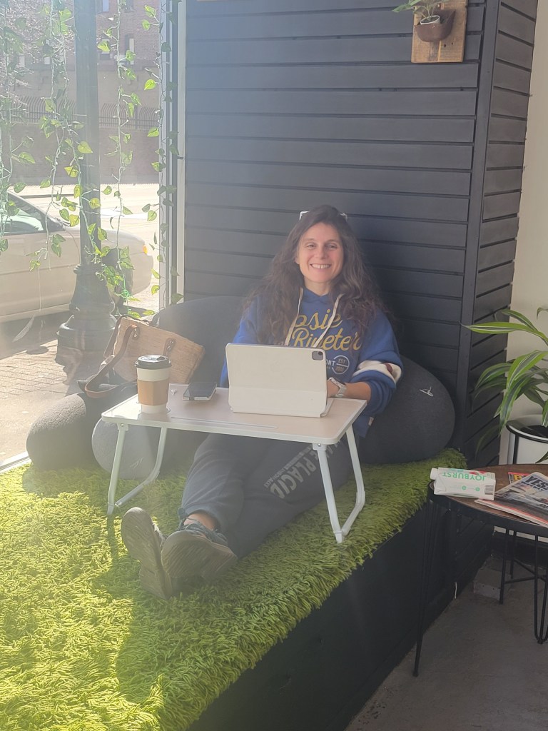 While Julie worked away in the van, Ryan found a table just inside the door of a clean, stylish coffee shop in downtown Greensboro, North Carolina, called Northern Roots Coffeehouse. Upon walking in, Julie was immediately taken in by the open concept, the clean lines, and the sleek design of the space. When she saw the window sill nook that had a breakfast-in-bed style lap desk to accompany pillows and a place to stretch out her legs, she knew she would be happy there.