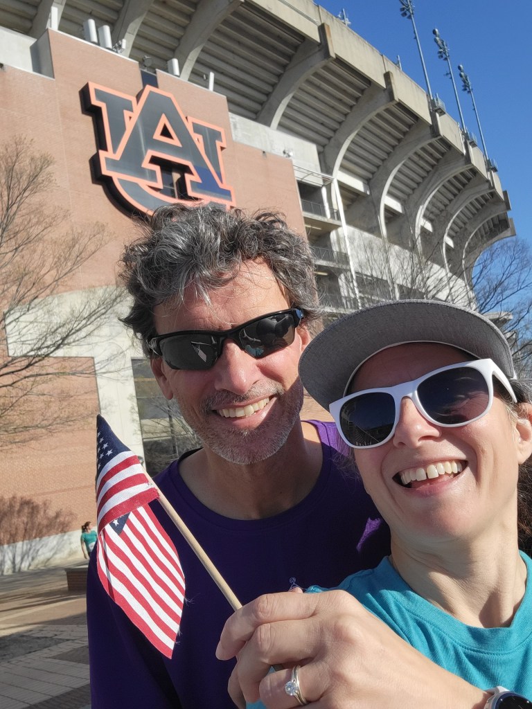 It was back to school again for our Alabama 5K. Our 47th 5K of this trip was our 7th run on a college campus. This was the largest and most prominent of them. The previous six traipsed through small and mid-sized regional colleges and universities. The Alpha Chi Omega 5K for DVA unfolded on the campus of 30,000 student, R1 research university, Division I athletic stalwart Auburn University in Auburn, Alabama.