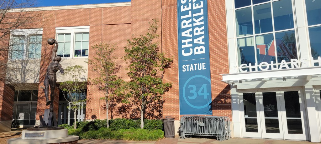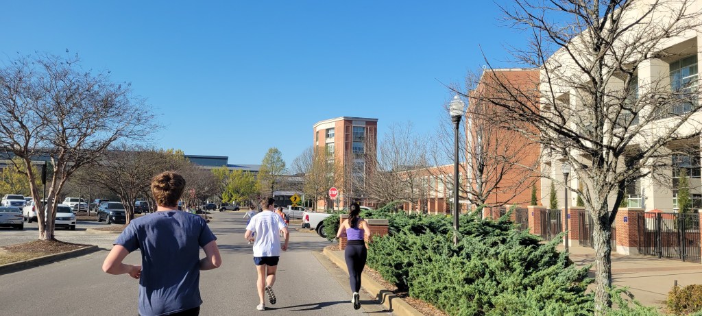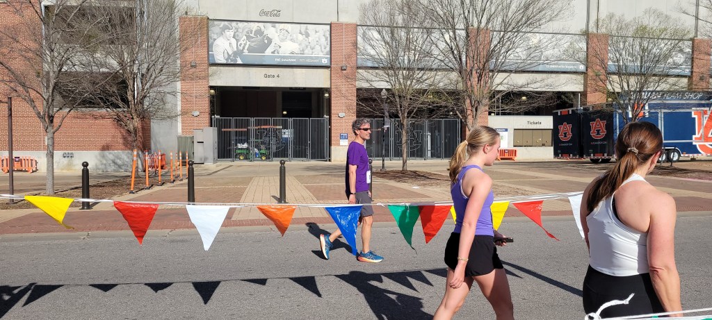 The course took us around the athletic facilities and other non-academic areas of the Auburn campus amidst small rolling hills – including one mid-race incline that made us work a bit. Beginning and ending in the shadow of storied Jordan-Hare Stadium, the aura of big-time college athletics permeated as we ran past the statues of Heisman Trophy winners Pat Sullivan, Bo Jackson, and Cam Newton, and past the arena where Charles Barkley and Chuck Person played college hoops.