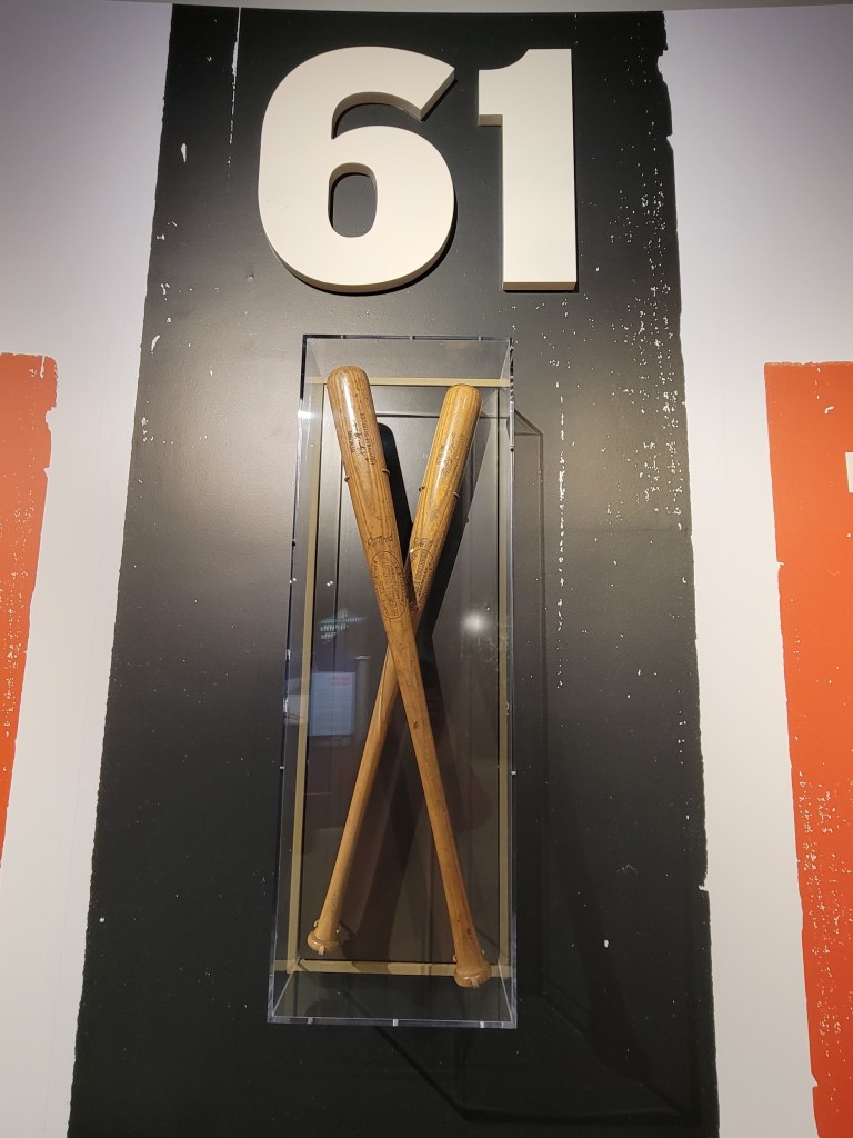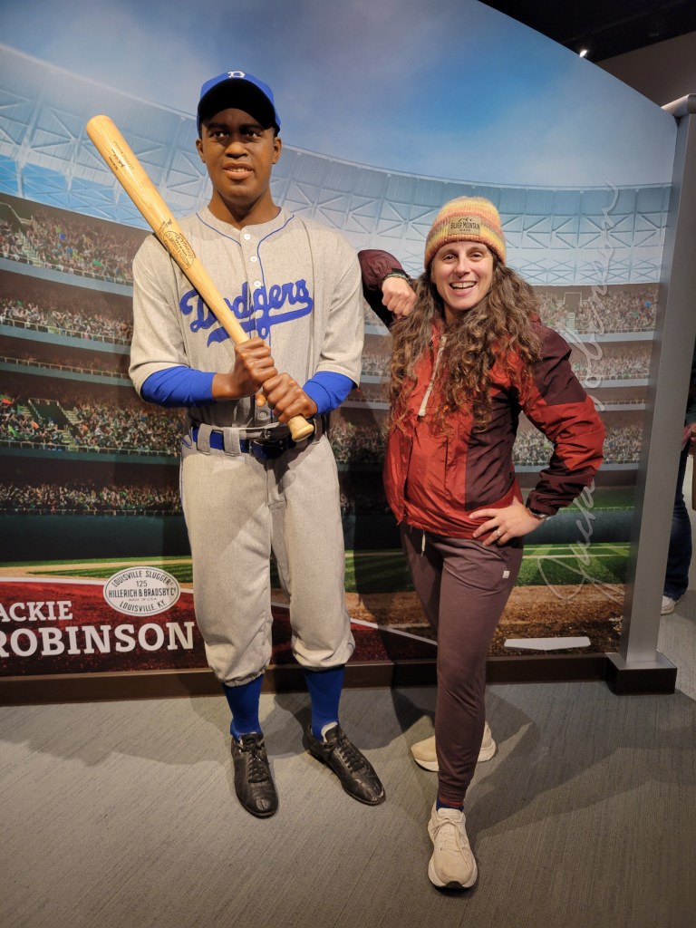 Our excitement went to a next level when we came upon one of the exhibits in the museum. They had game-used bats from some of the last century’s most famous players to hold and swing a Louisville Slugger that, through a very orderly and protected process, museum visitors were allowed to hold! We each selected a bat or two. Julie held Babe Ruth and Darryl Strawberry bats (incidentally the heaviest and lightest bats of the selection) and Ryan held a Hank Aaron bat. It was pretty neat. We were giddy enough from that.