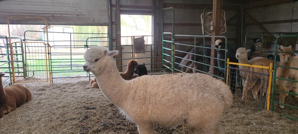 We stepped out of our van at the Alive N’ Fuzzy Alpaca Farm in Bowling Green, Kentucky, to the greeting of Eileen and her dog Peaches.