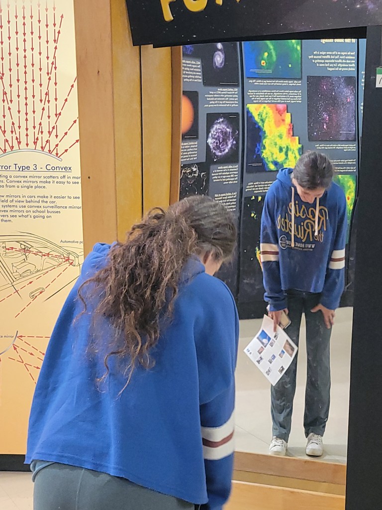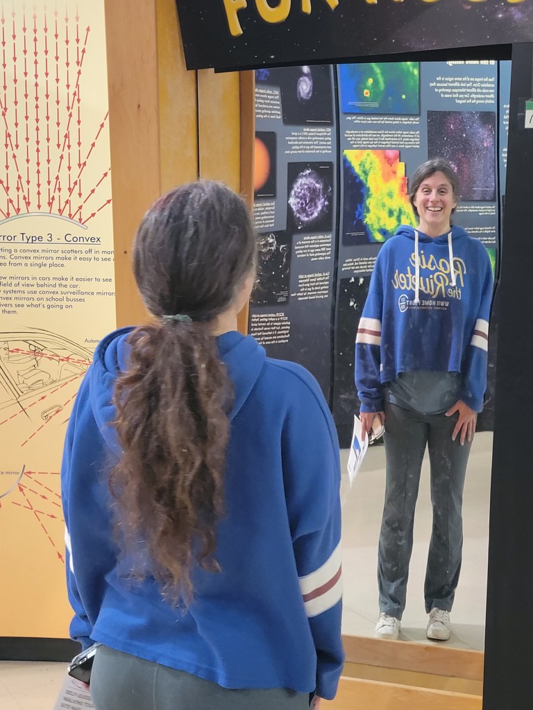 To educate the public about the mysteries of light and electromagnetic waves and how they shape reality by the various amplitudes and frequencies that make them up, the science center had a number of fun house mirrors. One such mirror was the kind that caused the object to be reflected in a vertically stretched manner – but not in one of those super wonky stretched out ways, just stretched out a little bit to add about 4 inches or so.
