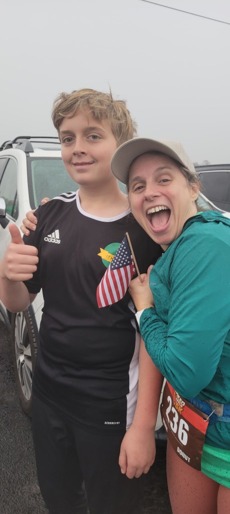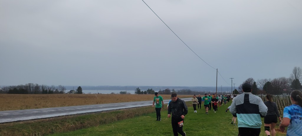 Ryan decided to run at a brisk jog. He wasn’t thrilled to run in the rain when the hard rain came, but by the time the race started, the rain had let up and it wasn’t so bad. He loved seeing all of the familiar faces that showed up and that buoyed him through the weather and the miles. He loved seeing our nephew on Julie’s side, Harley, at the turn around. The race course was grassy, uneven and a little slick. With a brisk jog, he ran faster than casual, but never at a pace where it got too bad. Because he wasn’t too focused on running fast, he really took in the setting. He loved running through the vineyards and getting to enjoy the view of the lake in the distance. When the race started on a downhill, he had been anticipating difficulty at the end of the race because of an uphill finish, but it wasn’t bad at all. After seeing a handful of people wipe out on the muddy turns, he made sure to take the turns carefully. Overall, the race was an enjoyable experience and though he was running without tremendous effort, he still clocked in at a very respectable 24+ minutes.