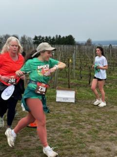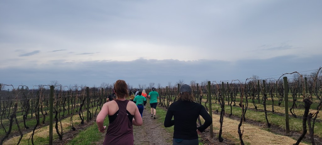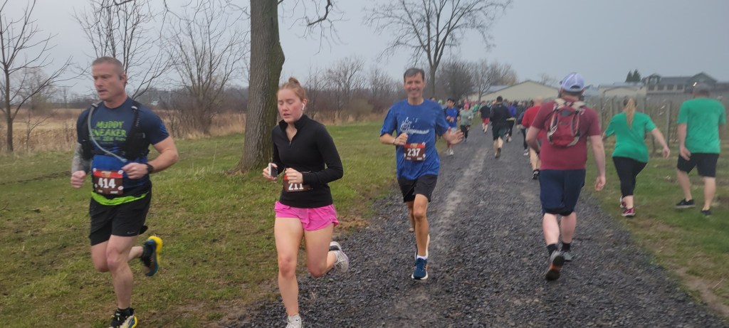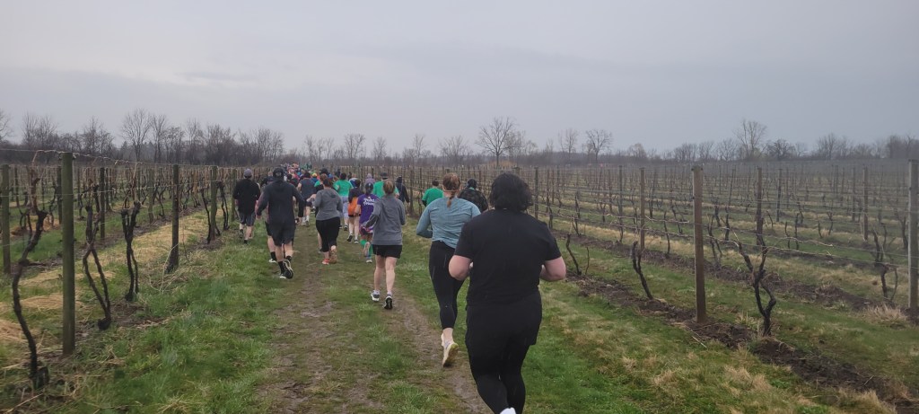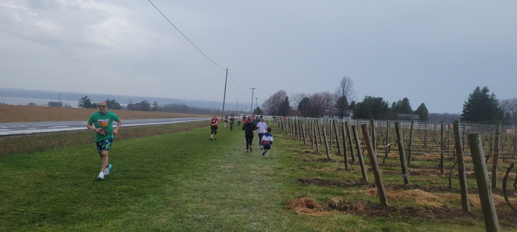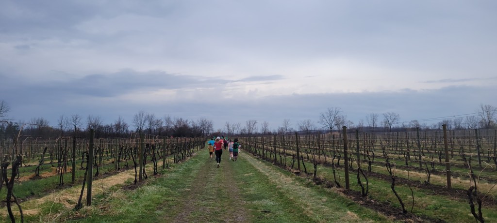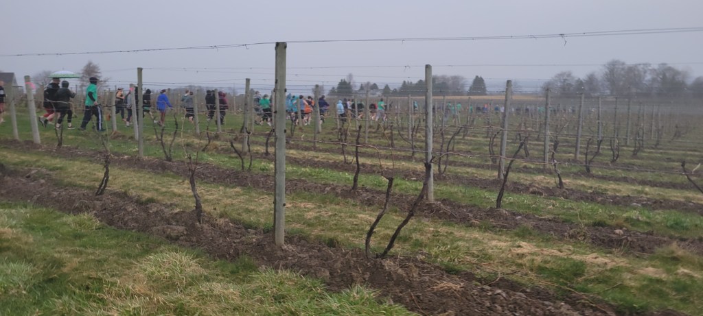The race meandered along slick, grassy equipment paths through rows of yet-to-blossom vines. The wet grass claimed multiple victims, with numerous runners taking mud slides as they cut some of each lap’s thirteen turns just a bit too sharply. While inglorious in the moment, those spills striped runners with muddy badges of honor. They wore that mud proudly as they crossed the finish line.